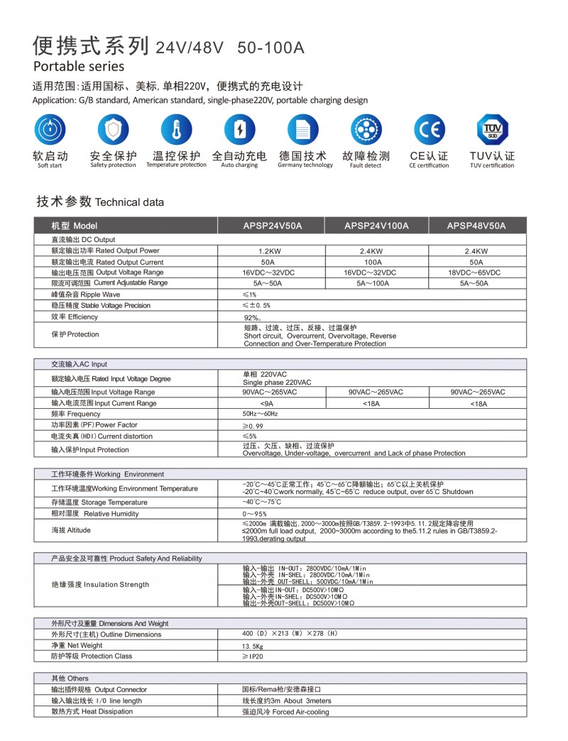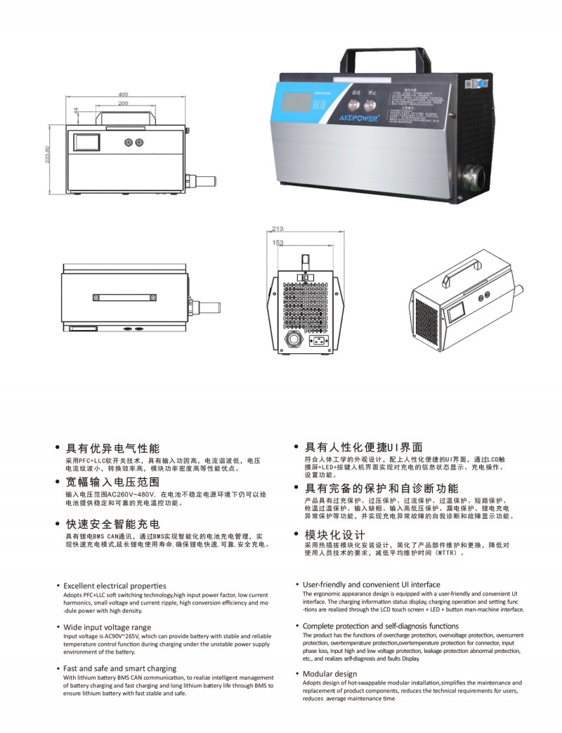 觸摸屏智能操作設(shè)計:告別傳統(tǒng)按鍵方式,給您帶來更現(xiàn)代更具科技智能的操作體驗 自動充電:插槍自動充電,簡化充電流程,便于操作 兼容性高:80V200A兼容48V200A充電 多重保護: 輸出短路,過流過壓保護,反接保護,電流導(dǎo)管保護等多重保護 預(yù)約充電功能:避開高峰用電時段,有效節(jié)省成本 雙語切換:中英文雙語隨需切換,跨越語言障礙,與世界接軌 人性化設(shè)計:充電機背板內(nèi)部附部件明細及產(chǎn)品接線圖,方便客戶可更清楚的了解產(chǎn)品,便于維修,提高售后時效 獨特設(shè)計: 內(nèi)置電磁鎖驅(qū)動模塊,防止臨時斷電鎖槍 使用壽命更長:功率模塊預(yù)留20%空間,提高模塊的使用壽命 出色內(nèi)部結(jié)構(gòu): 內(nèi)部結(jié)構(gòu)左右出風(fēng),內(nèi)部電路不容易積粉塵,提高充電機壽命