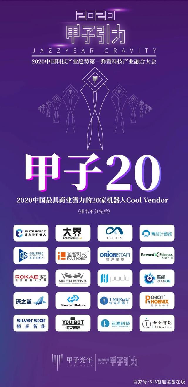 2020年11月14日,由工業(yè)和信息化部中國中小企業(yè)發(fā)展促進(jìn)中心支持、北京甲子光年科技服務(wù)有限公司主辦的2020「甲子引力」大會(huì)于北京舉辦。艾得特機(jī)器人、大界、非夕科技、博利葉智能、擎朗、高仙機(jī)器人、迦智科技、靈動(dòng)科技、優(yōu)艾智合、斯坦德、珞石、普渡、深方藍(lán)、鈦米機(jī)器人、翼菲自動(dòng)化、銀星智能、運(yùn)跡科技、云圣智能、梅卡曼德、獵戶星空、等20家入選2020“甲子20”暨2020中國最具商業(yè)潛力的20家機(jī)器人Cool Vendor。