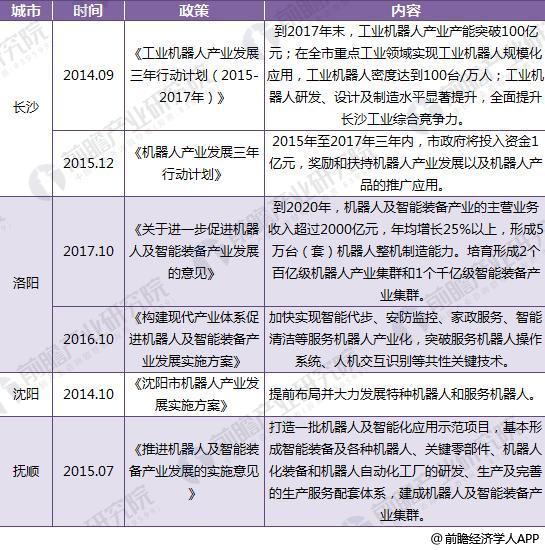 截至2018年,有14個地級市出臺機器人產業發展和加大科研投入建立智能型機器人研發機構的相關政策和獎勵機制,包括廣州、佛山、東莞、嘉興、泉州、長沙等。