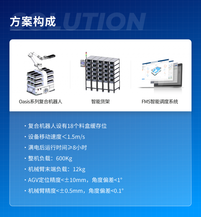 基于Oasis600UL搭載協(xié)作機(jī)械臂而成的復(fù)合機(jī)器人,可實(shí)現(xiàn)封測物料到達(dá)智能貨架后,由AMR從智能貨架自動(dòng)送入烘烤箱,烘烤完成后,由AMR自動(dòng)下料至氮?dú)庳浖埽刻丝砂徇\(yùn)18摞物料。