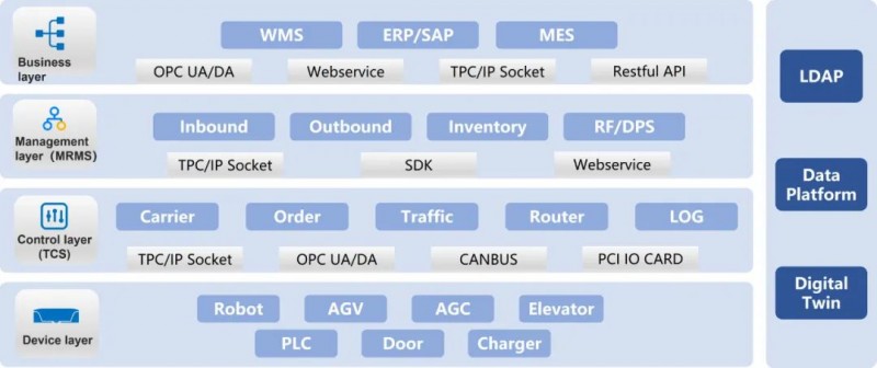 新松自主研發了強大的移動機器人控制系統——iMRS,不僅能實現復雜環境下的車體控制、邏輯調度,還能兼容客戶WMS、ERP、MES等上位系統,實現與工業機器人、PLC,電梯、智能門系統的協同作業,賦予移動機器人一顆智慧的大腦。