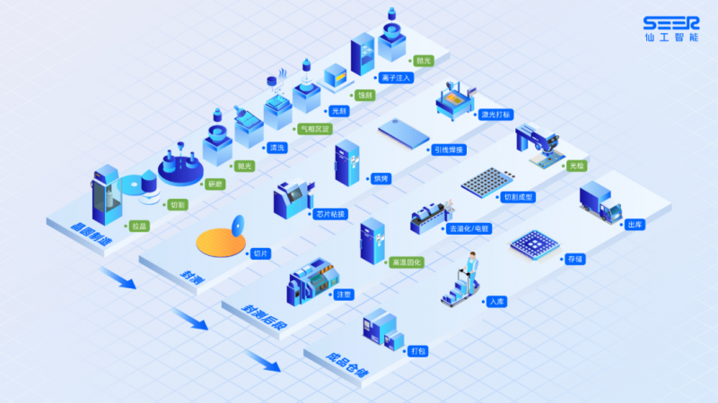 下圖為半導(dǎo)體整體工藝流程圖,其中藍(lán)色標(biāo)注點(diǎn)為『仙工智能半導(dǎo)體解決方案覆蓋環(huán)節(jié)』。目前,仙工智能已經(jīng)實(shí)現(xiàn)了『成品倉儲』節(jié)點(diǎn)全覆蓋。