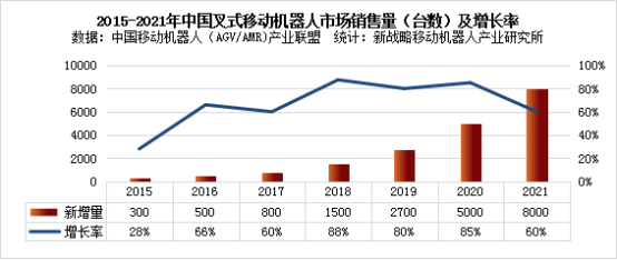 據(jù)中國移動(dòng)機(jī)器人(AGV/AMR)產(chǎn)業(yè)聯(lián)盟數(shù)據(jù)、新戰(zhàn)略移動(dòng)機(jī)器人產(chǎn)業(yè)研究所統(tǒng)計(jì),2021年中國叉式移動(dòng)機(jī)器人(含視覺導(dǎo)航)銷量達(dá)8000臺(tái),同比增長60%,市場(chǎng)規(guī)模約為24.5億元,同比增長42.40%。