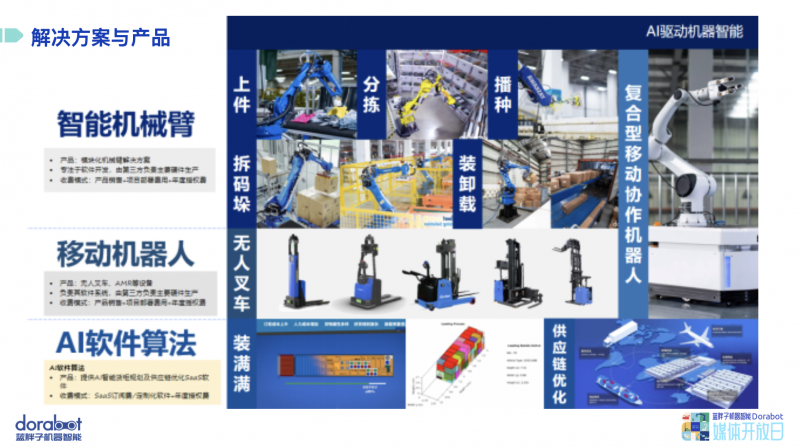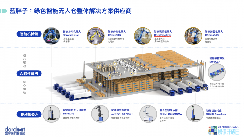 上件機器人DoraInductor、分揀機器人DoraSorter、包裝機器人DoraPacker、復合型移動協(xié)作機器人DoraMOMA等智能機器人齊上陣,讓人眼前一亮。值得一提的是,藍胖子裝載機器人DoraLoader也在媒體開放日上首度曝光,將在不久的未來落地實際應用。