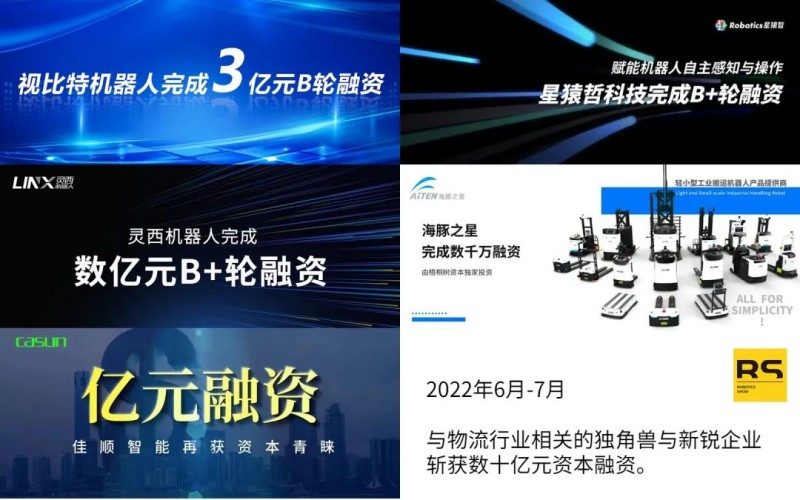 敏銳的資本最先觀察到這波新的移動(dòng)機(jī)器人(AGV/AMR)與物流相關(guān)機(jī)器人爆發(fā)苗頭。據(jù)不完全統(tǒng)計(jì),就2022年6月與7月間,與物流行業(yè)相關(guān)的獨(dú)角獸與新銳企業(yè)斬獲數(shù)十億元資本融資:視比特(展位號(hào):8.1H C198)完成3億元B輪融資,星猿哲科技(展位號(hào):7.1H E230)完成融資金額約4000萬(wàn)美元的B+輪融資,靈西機(jī)器人(展位號(hào):8.1H C062)完成數(shù)億元B+輪融資,佳順智能(展位號(hào):7.1H D125)再獲近億元人民幣的融資,海豚之星(展位號(hào):7.1H E175)宣布完成數(shù)千萬(wàn)元融資......均是千萬(wàn)級(jí)以上投資。