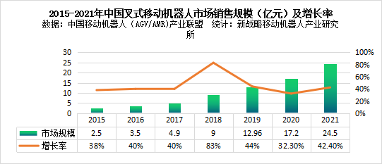 圖表:2015-2021年中國叉式移動機器人市場銷售規模(億元)及增長率