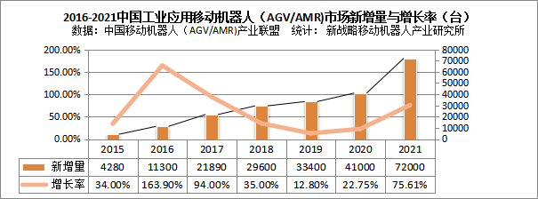 圖表:2015-2021中國市場企業工業應用移動機器人(AGV/AMR)新增量(臺)與增長率