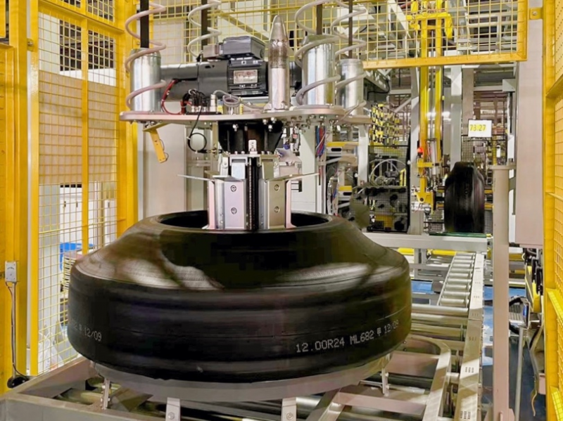 UQI優奇EMS自行小車的軌道布置在高空中,避開了擁擠的地面空間,以機械手從各個成型機收取胎胚。其最高運行速度高達200米/分鐘,可充分滿足大面積廠房的快速輸送需求。
