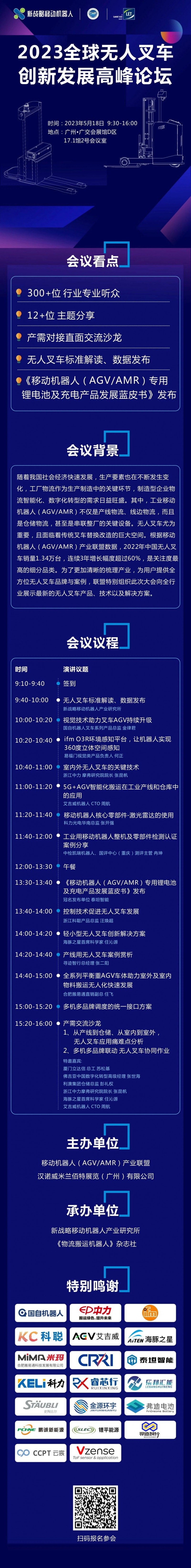 5月18日,為了更好地解讀無人叉車技術及市場應用現狀,由CMR產業聯盟主辦的“2023全球無人叉車創新發展高峰論壇”將在廣州重磅開啟,會議上,除14+主題演講外,還將重磅發布《移動機器人(AGV/AMR)專用鋰電池及充電產品發展藍皮書(2023版)》,敬請期待!