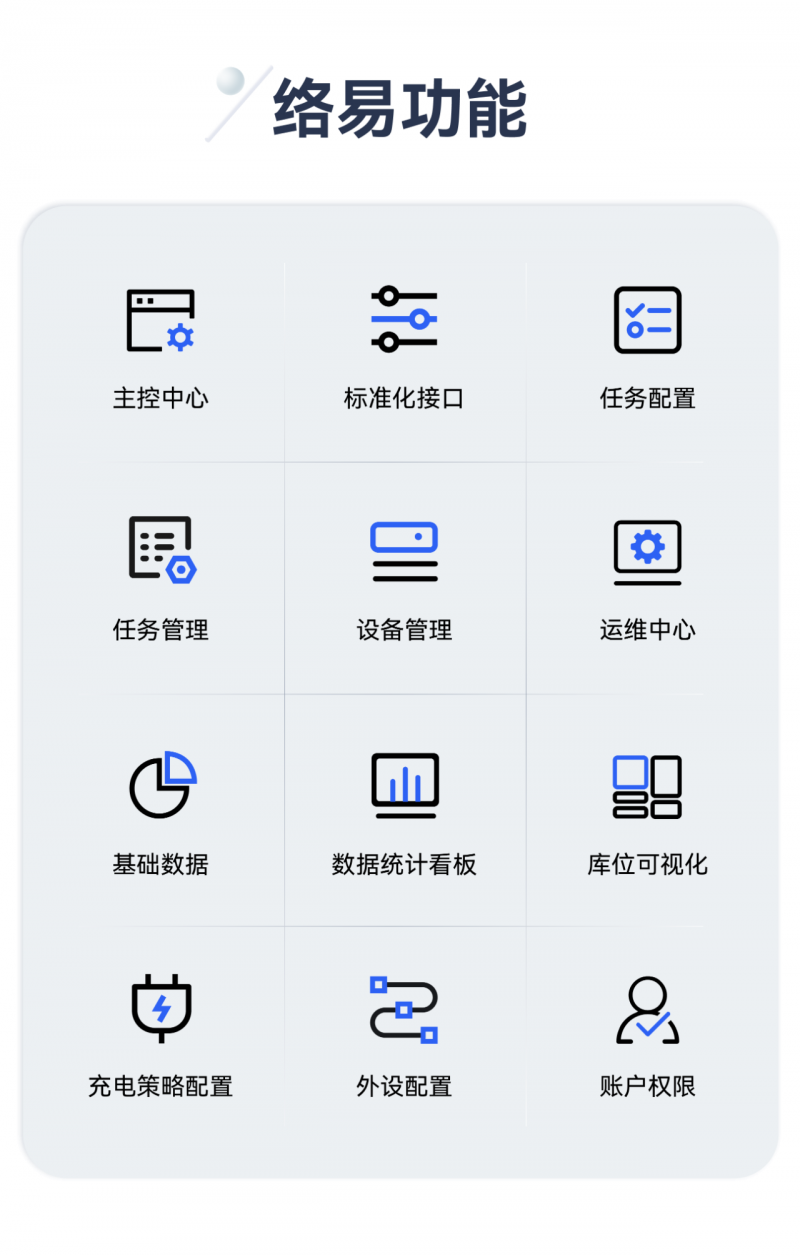 絡易的功能強勁,能滿足工廠和倉儲場景中小型項目的庫位管理、任務管理、車輛管理及容器管理等十大功能需求。也能通過標準任務接口連通上游系統(tǒng),靈活接受各種任務,并智能適配載具,滿足不同作業(yè)場景內(nèi)“點到點”、“點到區(qū)域”、“區(qū)域到區(qū)域”的搬運需求。