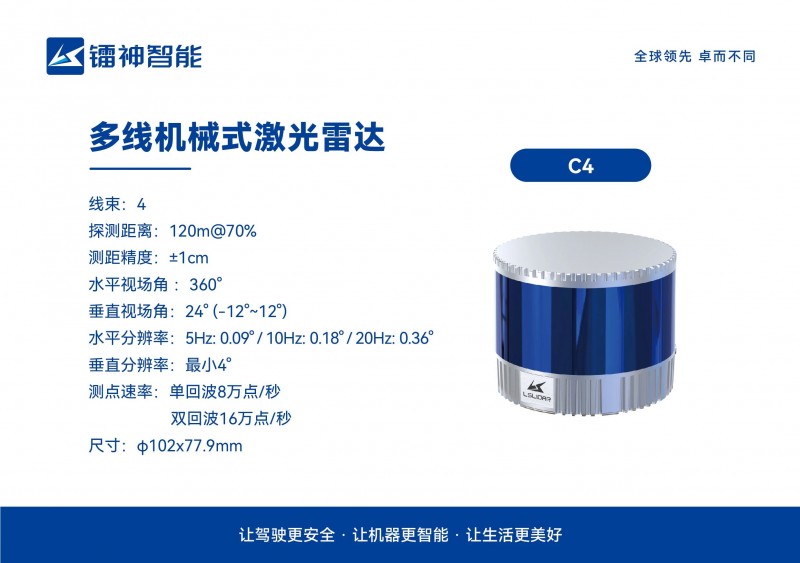 鐳神智能多線機(jī)械式激光雷達(dá)C4、C8和CH16R采用TOF時(shí)間飛行法,實(shí)現(xiàn)對(duì)周圍環(huán)境360°三維高速掃描,探測(cè)距離高達(dá)120m,測(cè)距精度可達(dá)±1cm,不易受外界環(huán)境光影響,產(chǎn)品體積小,具備非常強(qiáng)的應(yīng)用價(jià)值,可廣泛應(yīng)用于無(wú)人叉車、服務(wù)機(jī)器人、AGV、無(wú)人駕駛、安防、港口等領(lǐng)域,支持建圖、定位、識(shí)別、避障等功能,幫助客戶打開(kāi)更多市場(chǎng)空間。