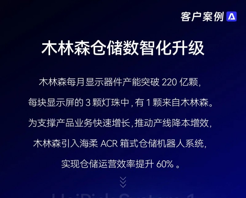 為加強木林森各業務端的智能化和柔性化水平,公司引進了海柔創新HaiPick System 1,通過以ACR為核心的多種自動化設備,實現產線成品的一體化智能拆垛、自動化出入庫、包裝、碼垛。