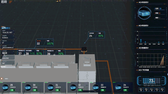 在某流通應(yīng)用場景中,海康機器人的數(shù)字孿生平臺采用先進(jìn)的“一屏多顯”技術(shù),能夠在一個界面上同時展示多個外部系統(tǒng)的統(tǒng)計數(shù)據(jù),用戶能夠迅速獲取并分析關(guān)鍵數(shù)據(jù),從而更好地監(jiān)管生產(chǎn)線的運行狀態(tài),確保生產(chǎn)過程的高效和順暢。