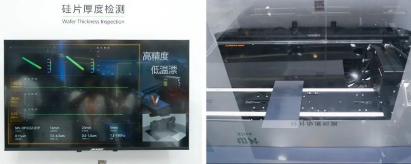 該環(huán)節(jié)還展示了硅片厚度/側(cè)邊檢測方案。其中,六臺3D激光輪廓傳感器測試硅片厚度,六臺相機(jī)兩兩對射,同時測量三組數(shù)據(jù)結(jié)果。硅片平均厚度數(shù)據(jù)重復(fù)性精度≤0.5μm,TTV(單線厚度波動)重復(fù)性精度≤1.5μm,線痕(單線輪廓高度)重復(fù)性精度≤2μm。
