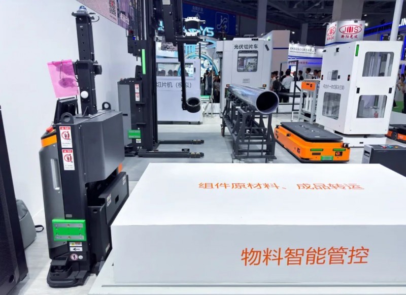 拉晶環(huán)節(jié)展示了自主設(shè)計研發(fā)的自動取晶AMR和重載AMR,二者協(xié)同作業(yè),取晶AMR從料架上取放晶棒,重載AMR進(jìn)行轉(zhuǎn)運(yùn)料架,實現(xiàn)晶棒自動化下線和實時轉(zhuǎn)運(yùn)。