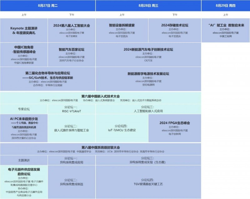 elexcon深圳國際電子展將于 2024年8月27-29日 在深圳會展中心(福田) 舉辦,圍繞嵌入式AI產業,現場重要展商及同期重要活動已公布,活動亮點先睹為快!