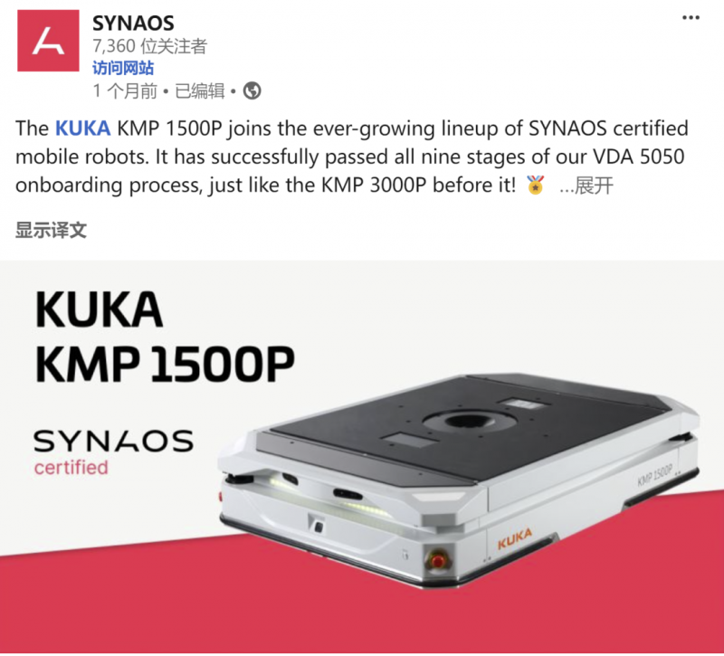 德國SYNAOS公司為世界著名的工業(yè)物流系統(tǒng)開發(fā)集成商。SYNAOS調(diào)度系統(tǒng)采用了現(xiàn)今工業(yè)物流領(lǐng)域主流的VDA 5050 協(xié)議。在SYNAOS公司嚴格的質(zhì)量要求下,KMP 1500P在實現(xiàn)了VDA 5050標準協(xié)議的同時,依次通過了SYNAOS 9步質(zhì)量檢測,達到了認證標準,現(xiàn)已成為SYNAOS集成項目中可靠的組成部分,并且可以應(yīng)用到更多行業(yè)領(lǐng)域賦能其內(nèi)部物流升級。