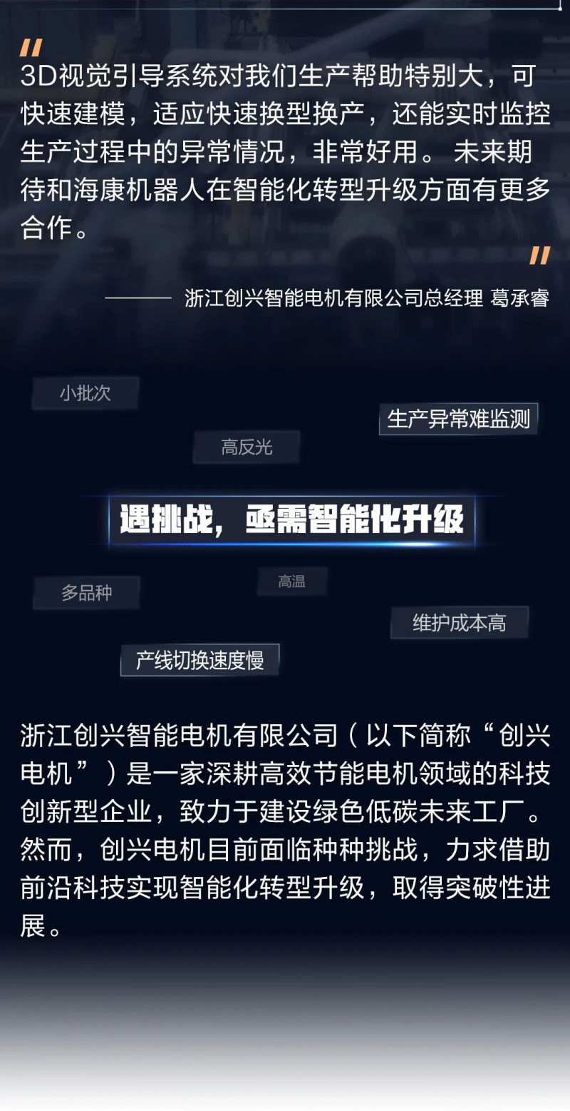 創興電機從需求匹配、生產效率、異常監測、數字化管理、建設成本等多個維度考慮,最終選擇與??禉C器人攜手,以工業4.0為標準打造未來工廠。