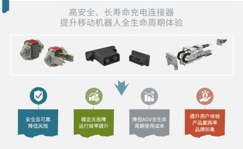 穩(wěn)定可靠的充電連接器,能避免移動(dòng)機(jī)器人充電故障,提高運(yùn)行效率,降低維護(hù)成本,提升 ROI。同時(shí),覆蓋全生命周期的充電連接器,TCO更低。