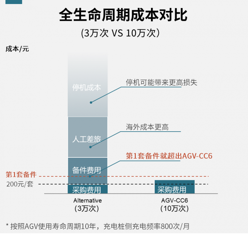 在移動(dòng)機(jī)器人的全生命周期內(nèi),與3萬(wàn)次插拔壽命的連接器相比,史陶比爾AGV-CC6連接器憑借高達(dá)10萬(wàn)次的插拔壽命,展現(xiàn)出了更為顯著的成本效益。具體而言,使用 AGV-CC6,10年內(nèi)僅需承擔(dān)首次采購(gòu)成本;競(jìng)品更換第一套備件后,累積成本就已遠(yuǎn)超AGV-CC6,還不包括其產(chǎn)生的大量人工成本和生產(chǎn)停機(jī)成本。此外,史陶比爾也在持續(xù)推進(jìn)本地化降本,使得AGV-CC6性?xún)r(jià)比更具優(yōu)勢(shì)。