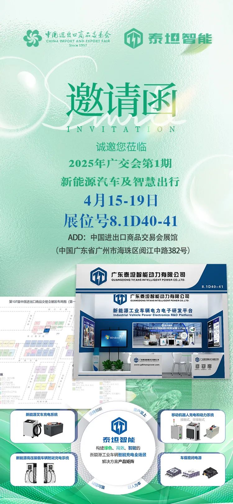 您好!泰坦智能誠摯邀請您參加第137屆中國進出口商品交易會,展會時間是4月15日至19日(第一期),我們的展位號是8.1D40-41。
