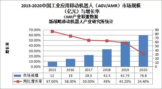 圖表:2015-2020中國工業(yè)應用移動機器人(AGV/AMR)市場規(guī)模(億元)與增長率