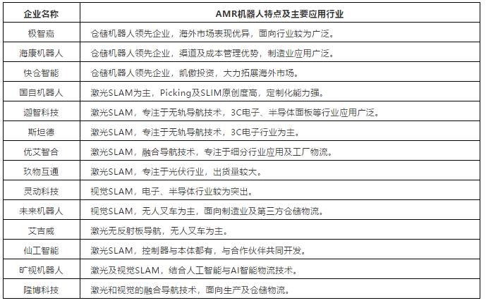 2020年AMR機(jī)器人應(yīng)用主要集中在3C電子、半導(dǎo)體、面板、新能源及光伏、電力成套及醫(yī)藥行業(yè)等制造領(lǐng)域,其中3C電子行業(yè)應(yīng)用規(guī)模最大,占比40%。值得注意的是,2020年AMR機(jī)器人在傳統(tǒng)的汽車市場(chǎng)也有滲透,但占比不大。主要原因在于新興制造業(yè)對(duì)生產(chǎn)線的柔性化要求程度更高,因此AMR在這些領(lǐng)域更受青睞。不過伴隨著AMR技術(shù)的進(jìn)一步成熟以及制造業(yè)產(chǎn)業(yè)升級(jí)的加速,未來AMR機(jī)器人將逐漸向更廣闊的市場(chǎng)延伸。