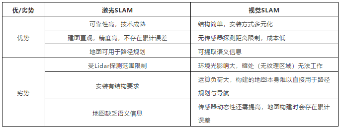 圖表4:激光SLAM和視覺SLAM優(yōu)劣勢(shì)對(duì)比