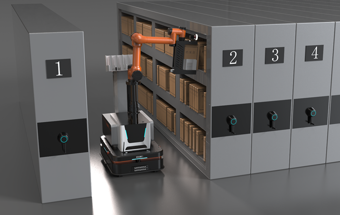 檔案存取機器人實現與智能檔案選層回轉柜的完美對接,接收業務系統下發的檔案信息,自動協調對應的密集架開合,自主移動到對應的檔案前,通過視覺識別檔案特征計算高精度檔案位置信息,控制機械臂移動到檔案前,實現檔案上下架作業。擁有一鍵式操作存取、指定區域一鍵盤點、智能計劃任務等功能,實現大型檔案庫房的資料自動存取。