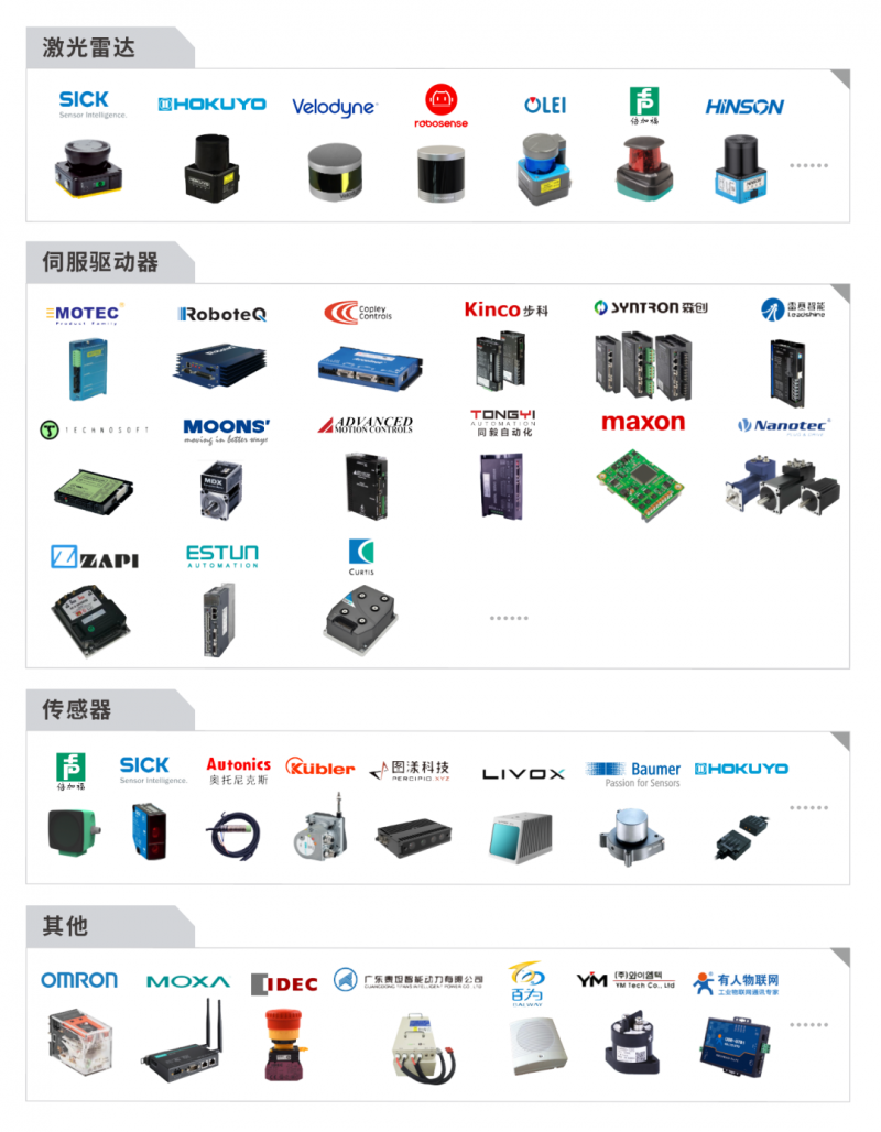 SRC 核心控制器功能強(qiáng)大,適配廣泛,已完成和各大傳感器、驅(qū)動(dòng)器廠商的產(chǎn)品適配,并繼續(xù)和他們密切合作,共建 AMR 的產(chǎn)業(yè)生態(tài)。