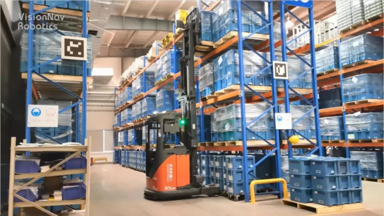 未來機器人前移式無人叉車最大舉升為9.4米,叉臂根部安裝了感知模塊,可以對橫梁狀況、庫位占用情況進(jìn)行安全檢測,為后續(xù)入庫作業(yè)提供信息輸入。且具備自適應(yīng)模塊,可以很好地滿足多次重復(fù)精準(zhǔn)叉取需求,提高作業(yè)的安全系數(shù)。同時其機器人管理系統(tǒng)可以對接自動門,當(dāng)無人叉車行駛到卷閘門附近時,系統(tǒng)提前發(fā)出指令到卷閘門,節(jié)省了人工操作的時間,保障物流通暢。