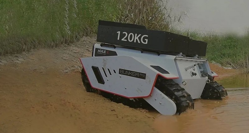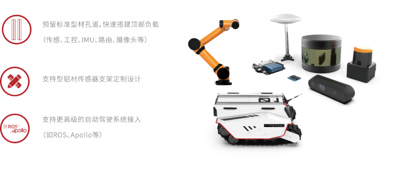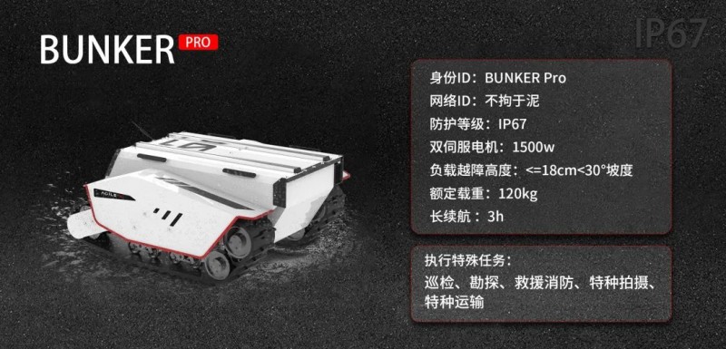 可以說,BUNKER Pro提供了在野外、箱涵、石泥路等高挑戰(zhàn)性環(huán)境下最佳的移動(dòng)開發(fā)平臺,助力機(jī)器人行業(yè)和科研客戶快速部署和開發(fā)特殊作業(yè)機(jī)器人,諸如巡檢、勘探、消防、特種拍攝、特種運(yùn)輸?shù)葢?yīng)用。BUNKER Pro外觀結(jié)構(gòu)全新設(shè)計(jì),車身重心位置低,裝置了1500W雙伺服電機(jī)進(jìn)行驅(qū)動(dòng),極具越野性。此外,其采用了克里斯蒂懸掛和瑪?shù)贍栠_(dá)四輪平衡多懸掛系統(tǒng)組合,并于全車安裝了加強(qiáng)版避震器和防撞擊結(jié)構(gòu)組件,外觀采用了高強(qiáng)度和大厚度的鋼材,這為執(zhí)行特種作業(yè)應(yīng)用提供了可靠的減震系統(tǒng)性能。 目前,BUNKER Pro最高越障可達(dá)18cm,爬坡度為<=30°,這意味著面對野外坡道和廠區(qū)樓梯,BUNKER Pro都可以一舉輕松爬越和穩(wěn)定運(yùn)行。BUNKER Pro驅(qū)動(dòng)形式為履帶差速轉(zhuǎn)向和左右獨(dú)立驅(qū)動(dòng),自研運(yùn)動(dòng)控制系統(tǒng)電機(jī)采用了2500線光電增量式碼盤,可以在復(fù)雜道路中實(shí)現(xiàn)高精度的控制,并且可以柔性實(shí)現(xiàn)0轉(zhuǎn)彎半徑原地自旋。BUNKER Pro外觀配置了防撞耐用的鋼質(zhì)結(jié)構(gòu), 且整車結(jié)構(gòu)、材料以及外置電氣元件均采用均采用高防護(hù)等級設(shè)計(jì),達(dá)到了IP67安全標(biāo)準(zhǔn),這是市面上同級別綜合路況移動(dòng)平臺中防護(hù)等級最高的。其具備沙塵滲透防護(hù)、移動(dòng)涉水和短暫浸泡防護(hù)(防浸)等優(yōu)勢,無懼任何潮濕、涉水、越野等極限工作環(huán)境,可以保證BUNER Pro極大拓展機(jī)器人的使用場景。基于高等級防護(hù)、模塊化和精簡部件結(jié)構(gòu)設(shè)計(jì),BUNKER Pro車體后期清潔也是十分便捷的,不藏污垢,不易腐蝕,易于維護(hù)。標(biāo)準(zhǔn)二次開發(fā)拓展應(yīng)用BUNKER Pro平臺空間大,可以在原地自旋過程中達(dá)到120kg載重,這意味著可以輕松搭載各類檢測設(shè)備。用戶可通過CAN總線協(xié)議與主控通訊,快速接入傳感系統(tǒng),搭建自主應(yīng)用開發(fā)平臺,同時(shí),BUNKER Pro也支持定制高級操作模式(遠(yuǎn)程駕駛/自動(dòng)駕駛),提供開源SDK、ROS_PACKAGE。BUNKER Pro還具有大電池容量,可在常規(guī)路面載重120kg運(yùn)行情況下支持3小時(shí)續(xù)航, 也可對搭載的傳感器等外部設(shè)備進(jìn)行供電, 為機(jī)器人應(yīng)用的作業(yè)提供充足和便捷的運(yùn)行保障。