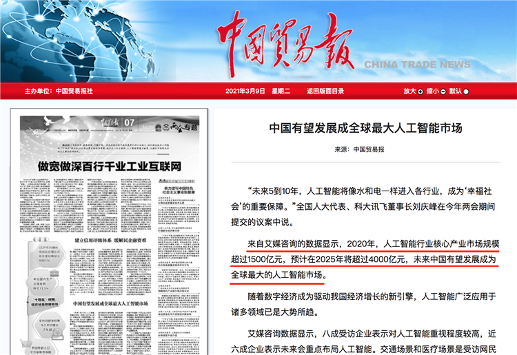 以人工智能為例,中國作為制造業(yè)大國,為其提供了豐富的應(yīng)用場景。據(jù)艾媒咨詢數(shù)據(jù):2020年人工智能行業(yè)核心產(chǎn)業(yè)市場規(guī)模將超過1500億元,預(yù)計(jì)在2025年將超過4000億元,中國人工智能產(chǎn)業(yè)在各方的共同推動(dòng)下進(jìn)入爆發(fā)式增長階段,市場發(fā)展?jié)摿薮螅磥碇袊型l(fā)展為全球最大的人工智能市場。
