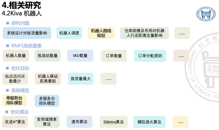 此外,趙寧教授介紹到,真正的物流仿真還涉及很多方面:如系統設計對揀貨量影響、機器人調度、機器人路線規劃、倉庫規模及布局對機器人行走距離定量影響;RMFS系統要素如機器人數量、揀選站數量、SKU數量、訂單數量、訂單分配原則;優化目標如站點訪問次數最少、機器人移動距離最短、揀貨量最大;系統模型單服務臺排隊模型、多服務合排隊模型;優化算法如改進A*算法、變鄰域搜索、遺傳算法、Diikstra算法、模擬退火算法等。