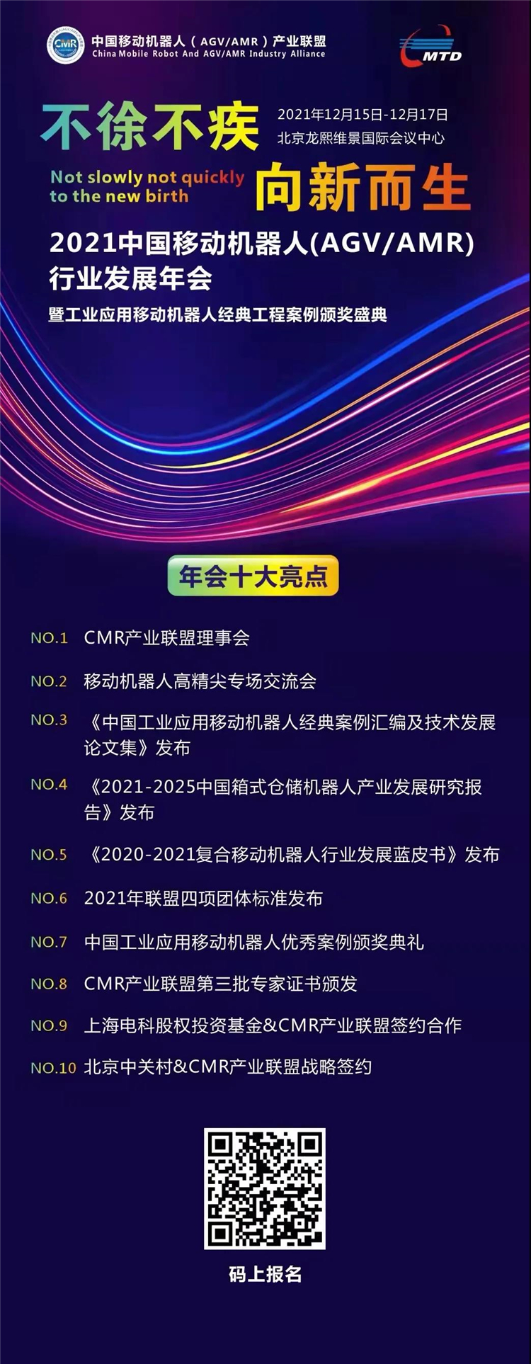 2021年12月15-17日,在由中國移動(dòng)機(jī)器人(AGV/AMR)產(chǎn)業(yè)聯(lián)盟主辦的“2021 中國移動(dòng)機(jī)器人(AGV/AMR)行業(yè)發(fā)展年會(huì)上,《中國工業(yè)應(yīng)用移動(dòng)機(jī)器人經(jīng)典案例匯編及技術(shù)發(fā)展論文集》將正式發(fā)布,晚宴還將舉行盛大頒獎(jiǎng)典禮,敬請期待!