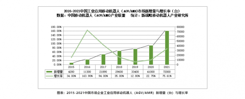 根據(jù)中國移動(dòng)機(jī)器人(AGV/AMR)產(chǎn)業(yè)聯(lián)盟數(shù)據(jù)、新戰(zhàn)略移動(dòng)機(jī)器人產(chǎn)業(yè)研究所統(tǒng)計(jì),2021年度,中國市場(chǎng)企業(yè)整體銷售工業(yè)應(yīng)用移動(dòng)機(jī)器人(AGV/AMR)72000臺(tái),較2020年增長(zhǎng)75.61%,市場(chǎng)銷售額達(dá)到126億元(海外銷售25億元),同比增長(zhǎng)64%。其中營(yíng)收超億元的企業(yè)達(dá)到36家,同比增長(zhǎng)50%。
